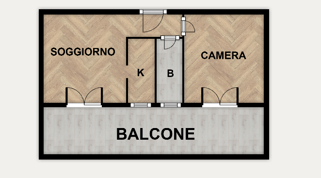 L’appartamento è composto da ingresso, soggiorno, cucinotto, camera da letto, bagno, balcone con affaccio al soggiorno e alla cucina, cantina e solaio.