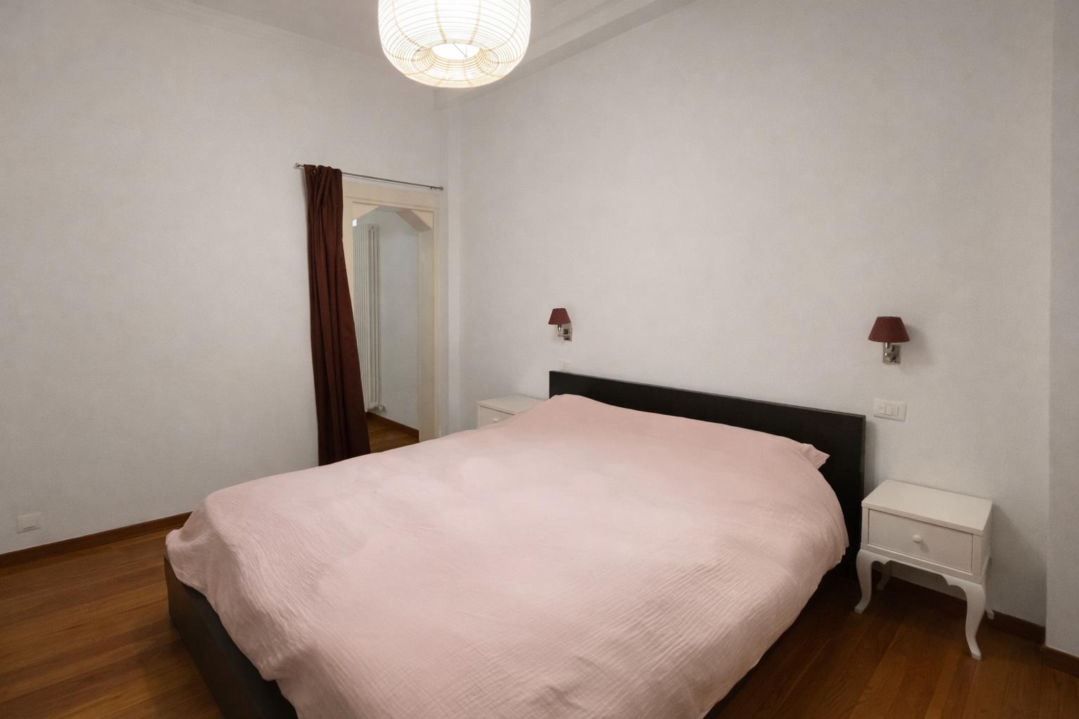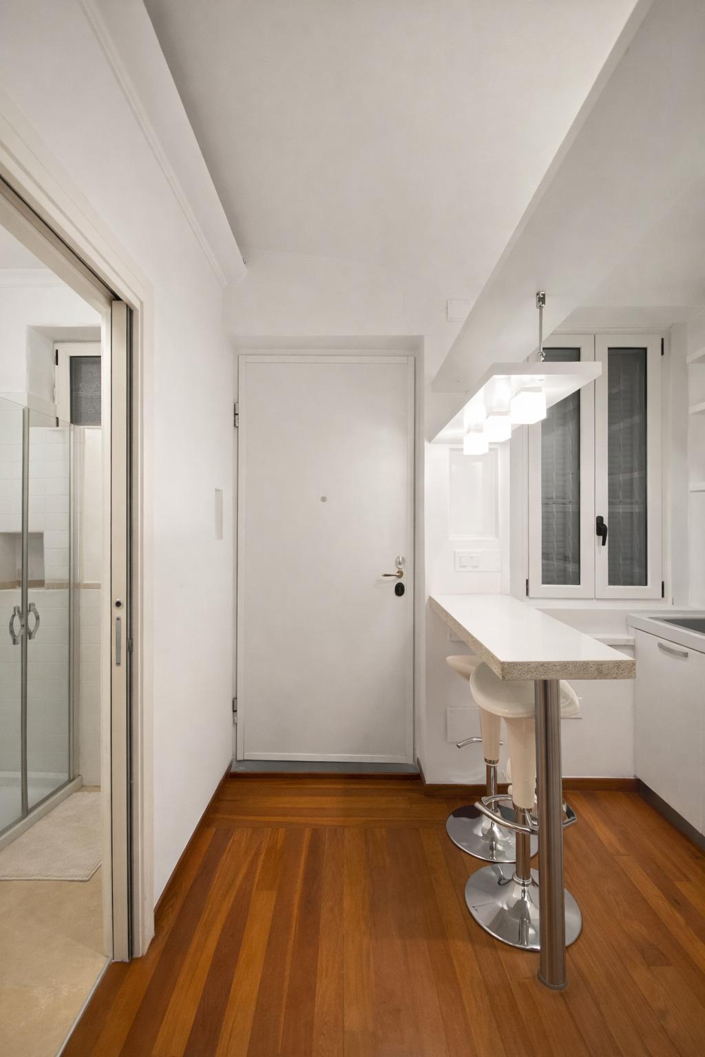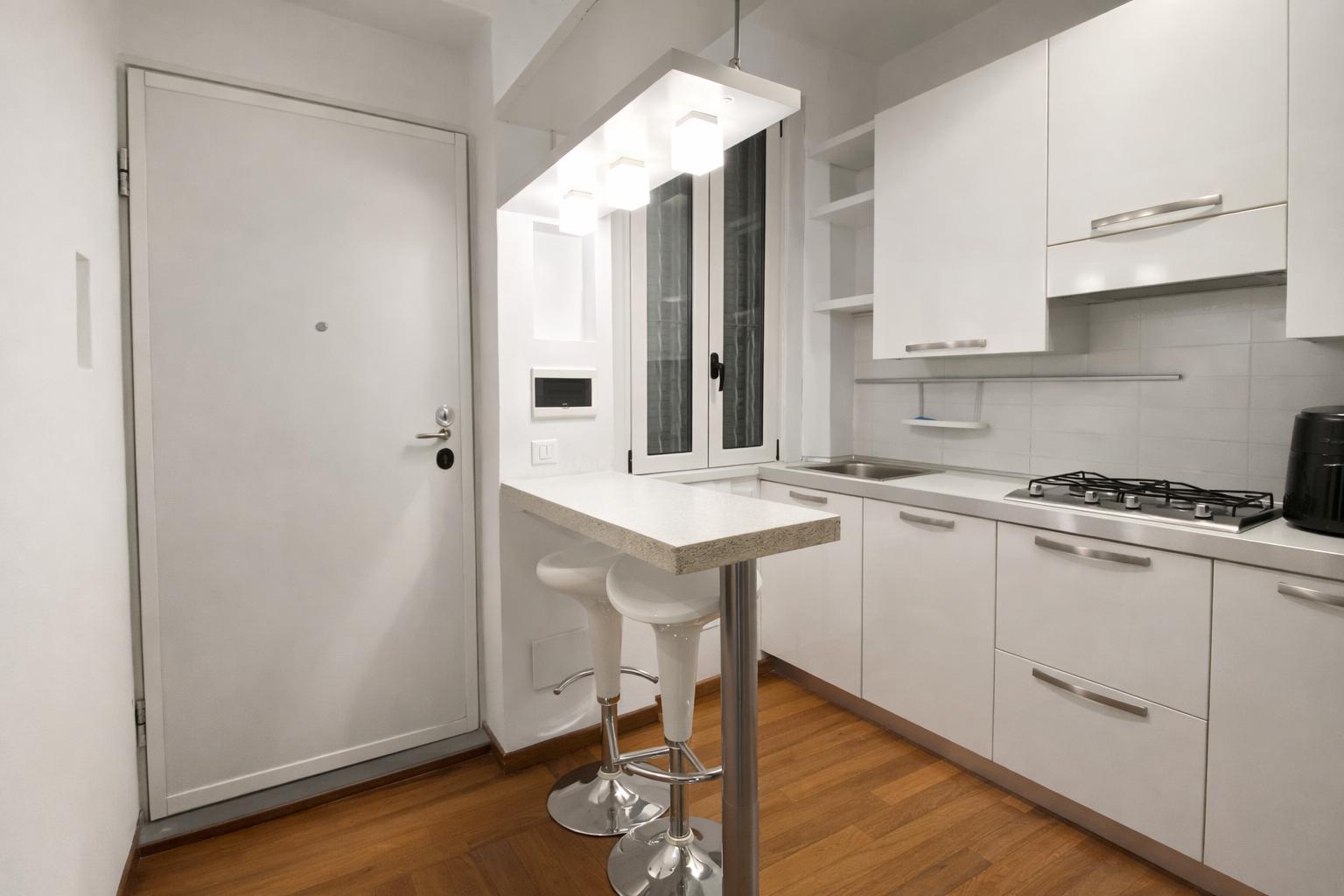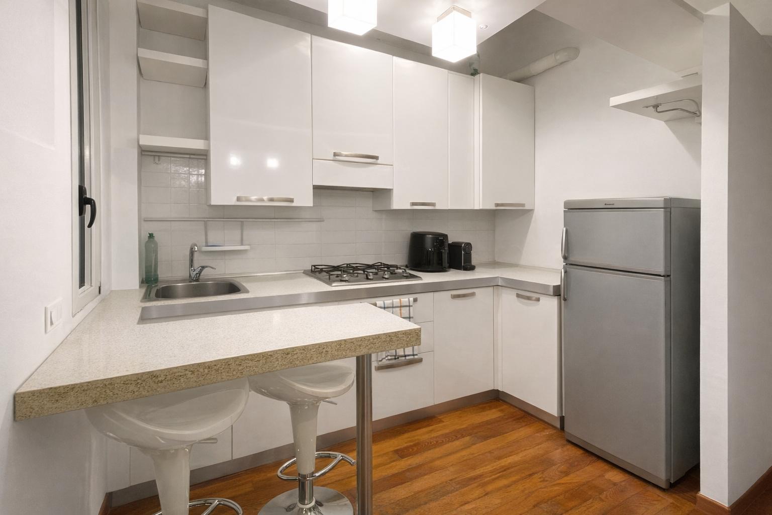 L’appartamento, molto luminoso e silenzioso grazie alla doppia esposizione sui cortili interni, si compone di ingresso privato, zona giorno con cucina a vista e area pranzo, camera da letto matrimoniale e bagno finestrato con box doccia.