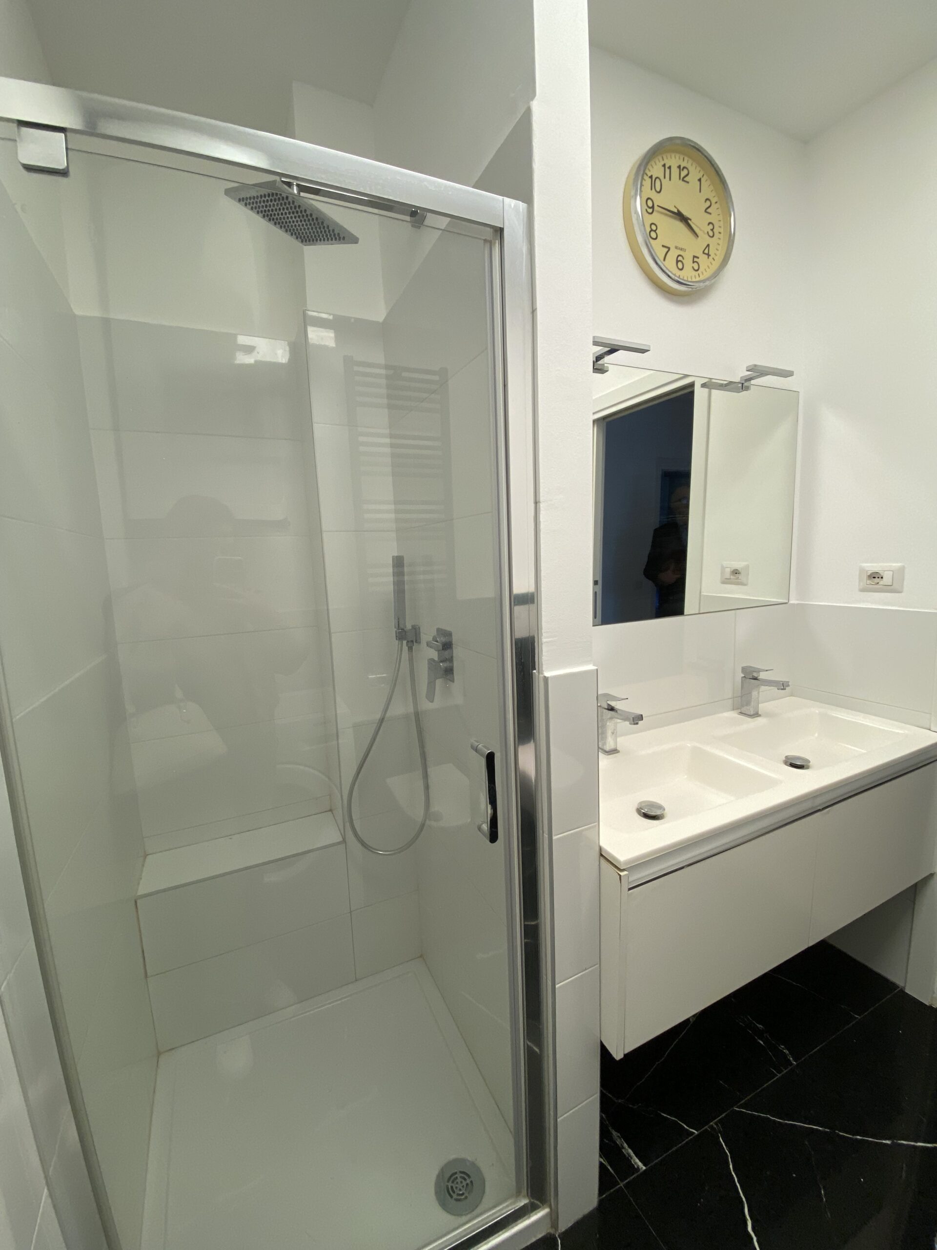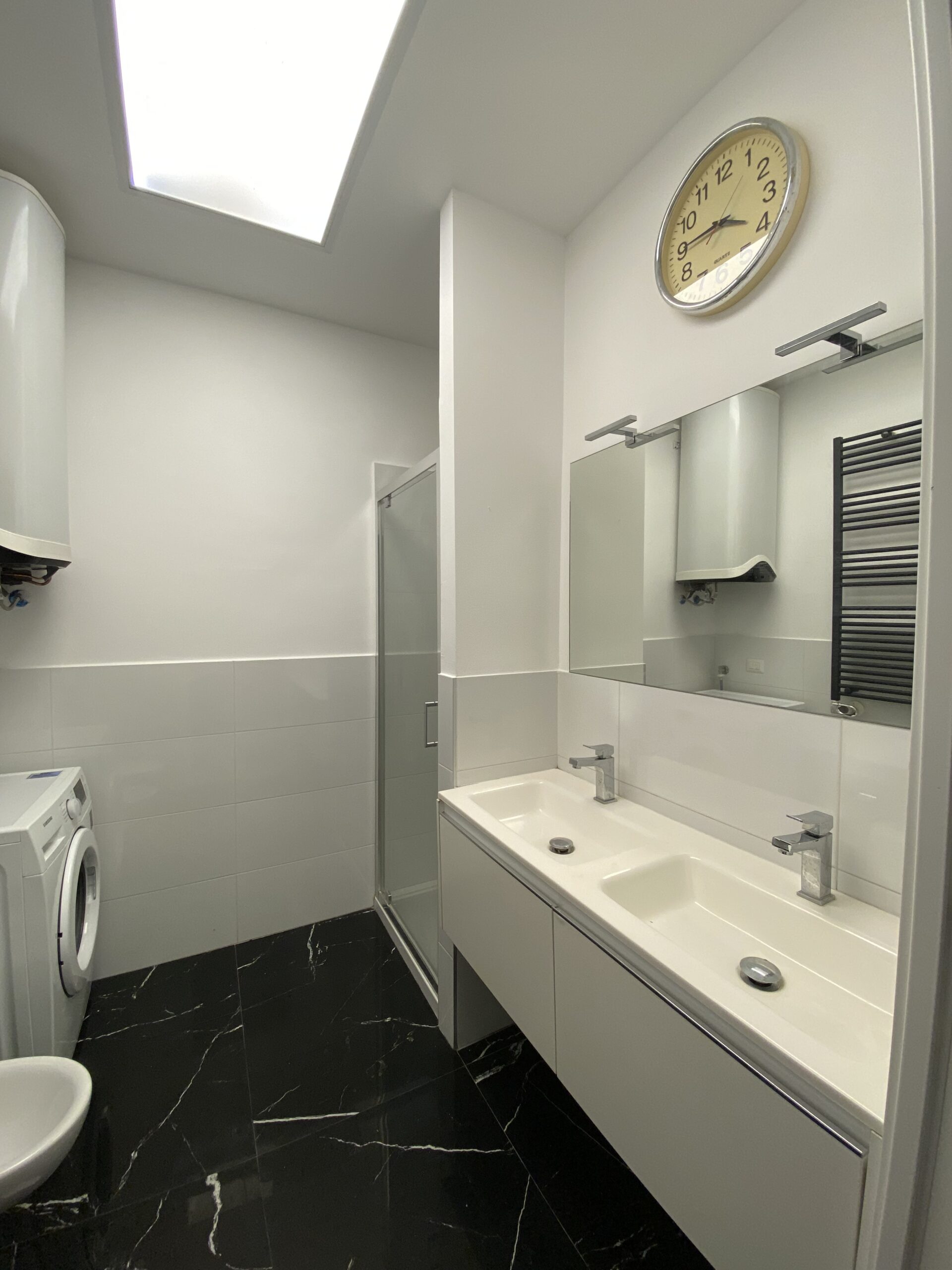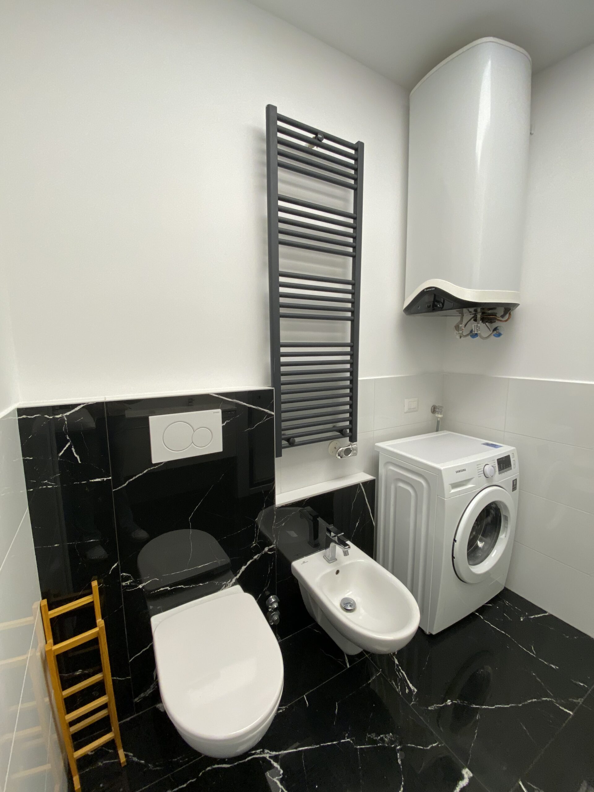 Pavimenti in gres porcellanato effetto legno, escluso il bagno dove troviamo il marmo.